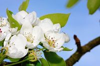 Appelbloesem tijdens de lente. De witte bloesem, de lichtgroene bladeren en blauwe hemel geven een zachte contrast. Een appel tak wordt getoond.