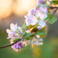 Foto van een bloeiende appelboomtak voor de ondergaande zon.