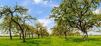 Appelbomen in de bloesem in een oude boomgaard tijdens een mooie dag in het voorjaar. De fruitbomen groeien in een veld waar in de verte koeien grazen. Panorama foto.