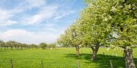 Oude appelbomen in een boomgaard met witte bloesem in het voorjaar. Koeien grazen in het veld in de achtergrond. Panorama foto samengesteld uit meerdere beelden.