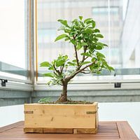 Appelboom als bonsai op een tafel op een balkon in de stad. Om het in de grote stad Maagdenburg in Duitsland niet zonder natuur te moeten stellen, haal ik graag de natuur in huis. Deze appelboom bonsai is ongeveer tien jaar oud.