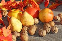 Appels, peren en walnoten op een rustieke houten tafel als herfstmotief