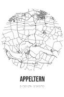 Zwart-witte landkaart, stratenplan of plattegrond van Appeltern. Appeltern is gelegen in de Betuwe, in de gemeente West Maas en Waal, provincie Gelderland. Op de stadskaart zijn alle openbare wegen in Appeltern opgenomen. Verder is de kaart voorzien van de coördinaten van het centrum van Appeltern.