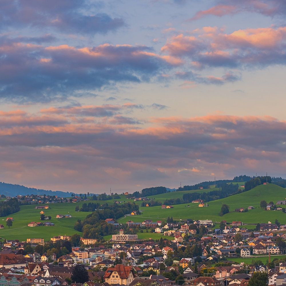 De zon zakt achter de heuvels van Appenzell (gelegen in het kanton Appenzell Innerrhoden in het noordoosten van Zwitserland tegen de grens met Oostenrijk, Liechtenstein en Duitsland) en schildert de lucht in tinten van goud, roze en koper.