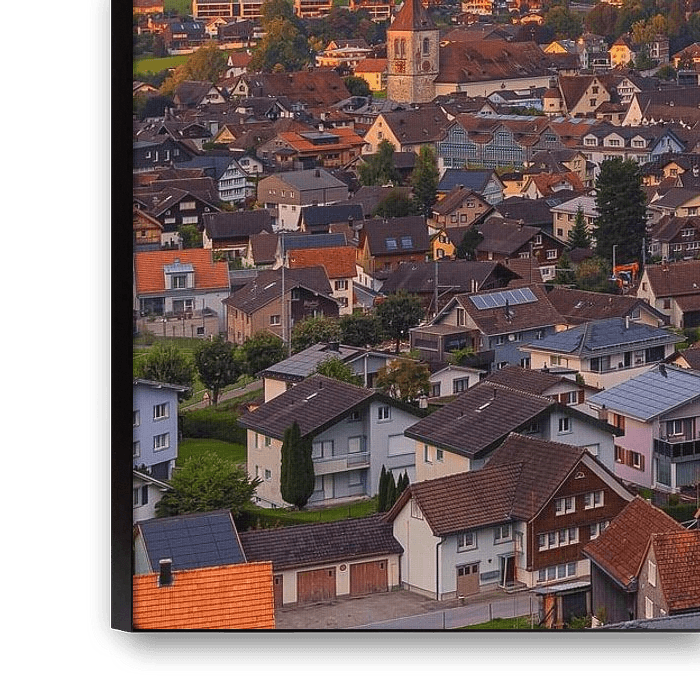 De zon zakt achter de heuvels van Appenzell (gelegen in het kanton Appenzell Innerrhoden in het noordoosten van Zwitserland tegen de grens met Oostenrijk, Liechtenstein en Duitsland) en schildert de lucht in tinten van goud, roze en koper.