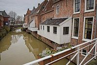 Huizen met "hangende" houten keukenuitbouw over het Damsterdiep in het historisch centrum van Appingedam (Groningen, Nederland).
