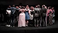 Een groep amateur artiesten neemt applaus in ontvangst van het publiek. Allen in gala