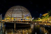 Een moderne glazen koepel huisvest de Apple Store in Singapore. Moderne architectuur kenmerkt de Marina Promenade in Singapore. Vooral 's nachts indrukwekkend.