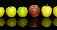 Rij met groene en een rode appel in gespiegelde zwarte omgeving