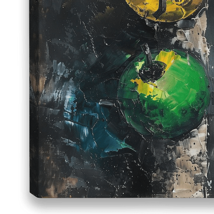 Een abstract schilderij van een verkeerslicht waarbij de lichten zijn vervangen door appels in rood, geel en groen.