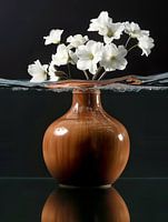 Een cognac porseleinen vaas met witte bloemen, grotendeels onderwater. Splitlevel stilleven. Hoog contrast.