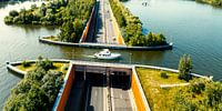 Aquaduct Veluwemeer in het Veluwemeer bij Harderwijk waar boten over de weg varen die Gelderland met Flevoland verbindt. Een plezierjacht vaart over de weg waar auto's via een tunnel de waterweg oversteken.