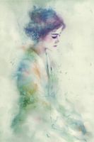 Een etherisch kunstwerk waarin zachte aquareltinten van groen, blauw en paars samenvloeien in een dromerige compositie. Het portret straalt een serene rust uit, waarbij de contouren subtiel vervagen in de achtergrond als een poëtische dans tussen vorm en kleur. De delicate penseelstreken creëren een tijdloze sfeer die doet denken aan een vroeg ochtendnevel.