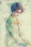 Een etherische aquarelcompositie waarin zachte groenen, blauwen en roze tinten samenvloeien in een dromerig portret. De delicate penseelstreken creëren een mysterieuze sfeer, waarbij de figuur lijkt op te lossen in de nevel van kleuren, wat resulteert in een tijdloos beeld van gratie en contemplatie.