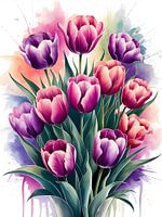 Een levendig aquarelschilderij met de delicate schoonheid van een boeket tulpen. Weelderige groene bladeren wiegen de bloesems, die een prachtig kleurverloop van paars en roze vertonen. Zachte, diffuse kleurspatten op de achtergrond versterken het bloemstuk en creëren een dromerige en elegante esthetiek.