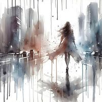 Aquarel Vrouw met lange wapperende haren , wandelend in de stad . Zachte blauwe en bruintinten