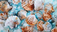 De kleuren variëren van warme aardetinten tot koele zeeblauwen, waardoor een contrastrijke maar harmonieuze compositie ontstaat. Deze schelpencollectie lijkt haast te dansen op het papier, met elke penseelstreek die de delicate details en patronen van de schelpen benadrukt. De vloeiende achtergrond doet denken aan de zachte beweging van water, waardoor een gevoel van diepte en beweging ontstaat. Het kunstwerk roept beelden op van een zonnige dag aan het strand, waar de zee haar schatten op het zand heeft achtergelaten.
