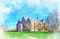 Aquarel van de Nikolaaskerk in Brouwershaven, Schouwen-Duiveland, Zeeland. In het pittoreske plaatsje Brouwershaven vindt u deze indrukwekkende middeleeuwse kerk uit de 15e eeuw