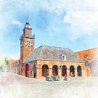 Deze aquarelafbeelding laat een historisch pand in Sluis zien dat momenteel als brandweerkazerne dienst doet. Het pand stamt uit het midden van de 18e eeuw. Tijdens de tweede wereldoorlog is het pand verwoest. Bij de herbouw werd de slangentoren toegevoegd.