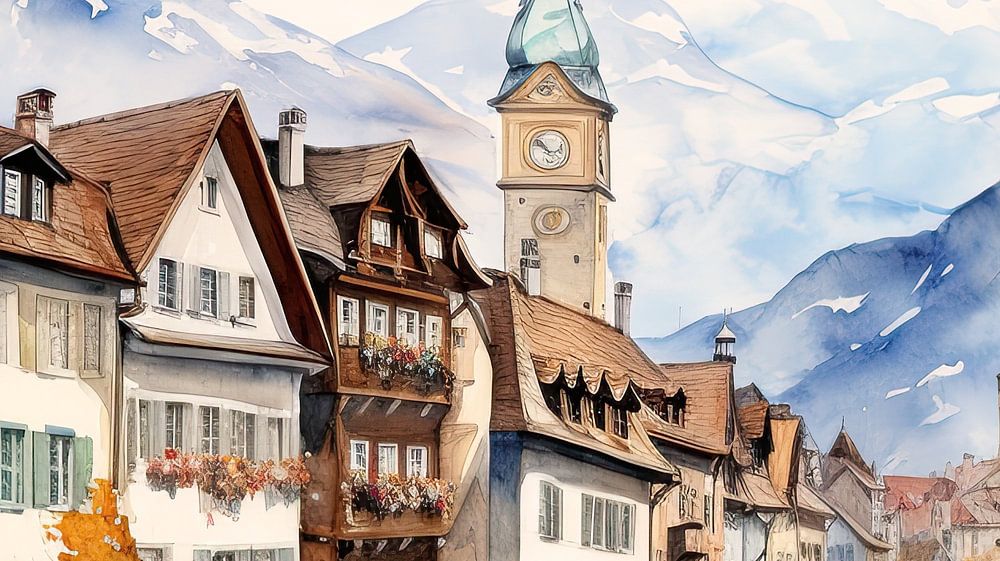 Over "Aquarel bergstadje in Alpen berglandschap"