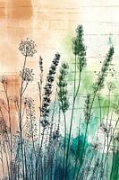 In deze botanische kunstprint dansen zwarte bloemenstelen en wilde kruiden over een achtergrond van zachte aquarelverlopen in groen, blauw en perzik. De tekening is elegant en minimalistisch, maar de kleuren zorgen voor warmte en levendigheid.