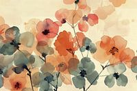 Een kunstwerk van bloemen in aquarel. Mooie zachte blauw en roodtinten op een beige achtergrond. Een warm en minimalistisch geheel voor aan de muur.