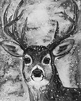 Prachtige aquarel van een hert met een mooi gewei in een landschap van ijs en sneeuw. Mooie afbeelding voor in de winter, kerst, maar het kan natuurlijk ook voor het hele jaar.