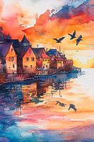 De charmante huizen aan het water komen tot leven in zachte aquareltinten, terwijl de schemering de lucht baadt in een prachtig kleurenspel. Zachte golven weerspiegelen de gouden zon, terwijl vogels er vredig boven vliegen. Dit kunstwerk geeft elke woonkamer een uitnodigende sfeer en wekt het verlangen naar idylle en ontspanning.