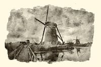 Aquarel van molens in Kinderdijk, Nederland. Dit aquarel is digitaal gegenereerd van de originele foto. Er zijn meerdere versies van dit aquarel in deze webshop, waaronder een zwartwit versie. De originele foto wordt ook aangeboden in deze webshop.