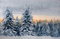 Aquarel of waterverf schilderij van een winterlandschap. Je ziet met sneeuw bedekte sparren. De opkomende zon kleurt de lucht terwijl de sneeuwvlokjes vallen.