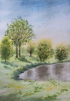 Aquarel of waterverf schilderij van een lentelandschap, waar de bloemetjes in het gazon verschijnen, en de frisse groene blaadjes weer aan de bomen groeien.