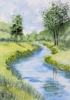 Aquarel of waterverf schilderij van een lentelandschap met een riviertje tussen de weilanden en bloemetjes in het gras.