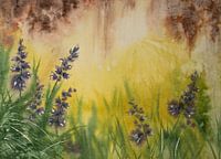 Aquarel of waterverf schilderij van een weiland met wilde hyacinten. De zon komt op en werpt een gouden licht over het tafereel.
