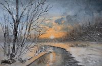 Aquarel of waterverf schilderij van een winters landschap. Je ziet een riviertje met reflectie en bomen in het besneeuwde veld. De zon komt op tussen de wolken.