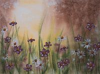 Aquarel of waterverf schilderij van een weiland met wilde bloemetjes en madeliefjes. De zon komt op en kleurt de lucht warm en oranje.