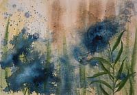 Aquarel of waterverf schilderij van een weiland met grote blauwe bloemen. Het schilderij is op een losse manier gemaakt.