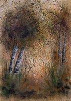 Aquarel of waterverf schilderij van een herfstlandschap. Je ziet enkele berkenbomen tussen de struiken. De gebruikte kleuren zijn bruin en oranje.