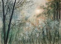 Aquarel of waterverf schilderij van een sprookjesachtig landschap met bomen en witte bloemetjes, bij zonsopkomst. De gebruikte kleuren zijn pasteltinten.