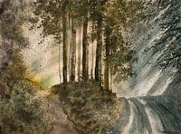 Aquarel of waterverf schilderij van een boslandschap. Aan de rechterkant zie je een wandelpad bij naaldbomen en links loopt een ander wandelpad tussen de loofbomen. De zonnestralen verwarmen de hogere delen.