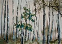 Aquarel of water verf schilderij van een berkenbos in de mist. Op de voorgrond staat een enkele kleine zomereik.