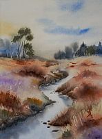 Aquarel of waterverf schilderij van een heidelandschap. Het is herfst en de heide is bruin met nog hier een daar een vleugje paars. Er loopt een beekje door het landschap.