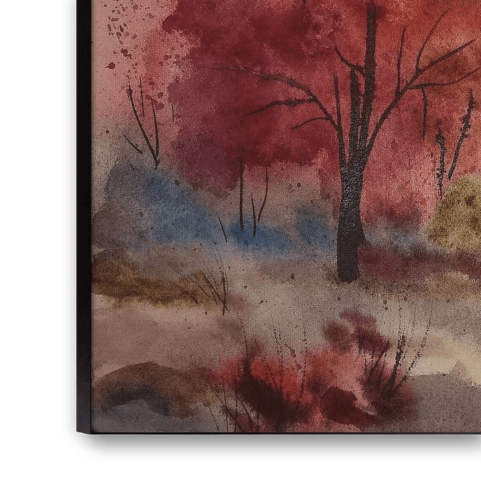 Aquarel of waterverf schilderij van een herfstlandschap. Je ziet een klein kerkje tussen de bomen die prachtige herfstkleuren vertonen. De hemel is bewolkt.
