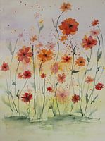 Aquarel of waterverf schilderij van oranje en rode wilde bloemen. Op de achtergrond zie je de kleuren van een zonsopkomst.