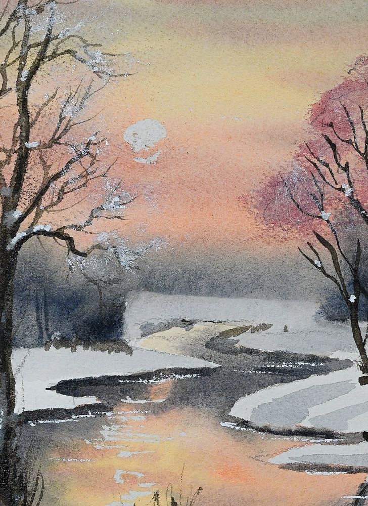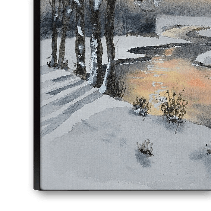 Aquarel of waterverf schilderij van een winterlandschap met een riviertje en bomen op de besneeuwde oevers. De lucht kleurt prachtig door de opkomende zon en reflecteert in het water.