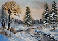 Aquarel of waterverf schilderij van een winterlandschap met een riviertje en bomen op de besneeuwde oevers. Het gouden licht werpt warme schaduwen over het landschap.