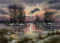 Aquarel of waterverf schilderij van een winterlandschap. Je ziet een bevroren meer met enkele mensen op en een paar eilandjes met bomen. De lucht vertoont prachtige kleuren door de ondergaande zon.