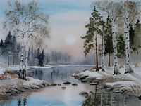 Aquarel of waterverf schilderij van een winterlandschap bij zonsopkomst. Je ziet een meer met verschillende bomen op de oevers. het is mistig en koud en de lucht vertoont prachtige pastelkleuren.