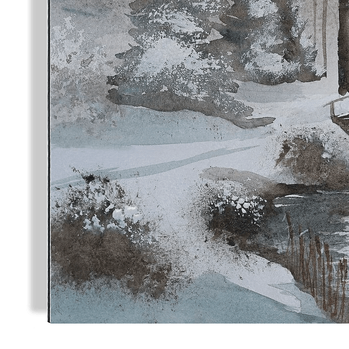 Aquarel of waterverf schilderij van een winterlandschap. Je ziet een riviertje met daar overheen een bruggetje. Er is een winterzonnetje en er ligt een dik pak sneeuw.