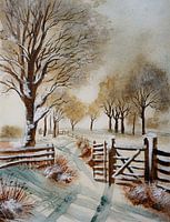 Aquarel of waterverf schilderij van een winterlandschap, met een poortje in de omheining, dat leidt naar het wandelpad op het platteland.