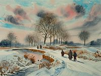 Aquarel of waterverf schilderij van een winterlandschap. Je ziet enkele wandelaars op het besneeuwde wandelpad, naast een watertje, onder een mooie wolkenlucht.